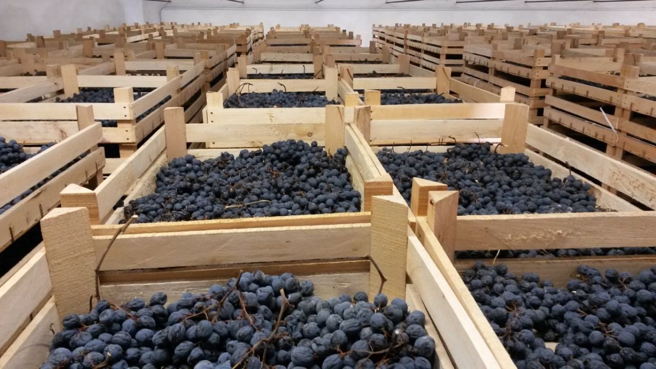 Il processo di “appassimento” avviene naturalmente e dura dalla fine della vendemmia e per tutto l’inverno, circa, innescando quei micro-processi necessari ad arricchire gli acini di aromi nuovi, concentrando gli zuccheri naturali e tutto quello che servirà a dare corpo, struttura, profumi e colore ai vini.