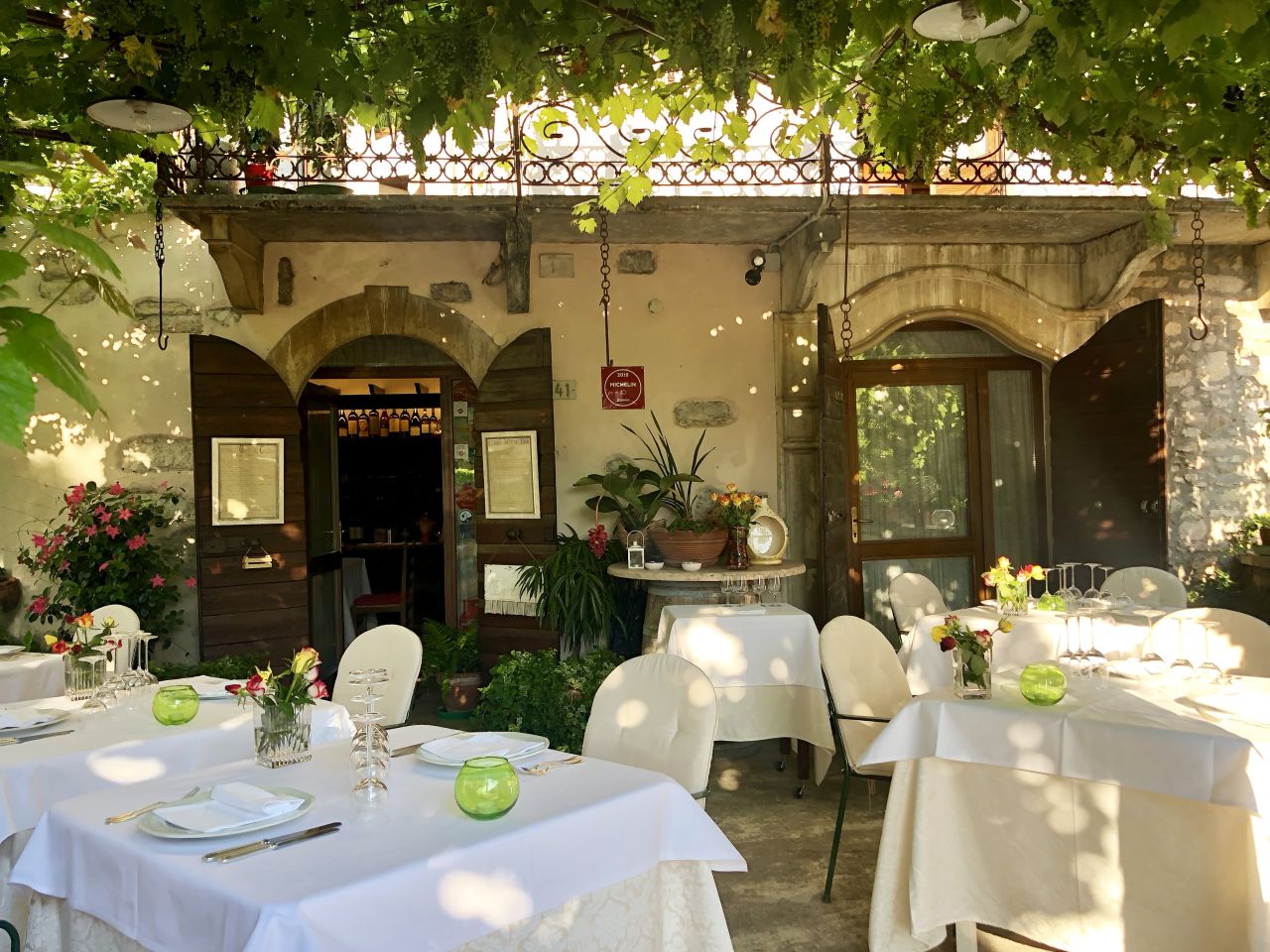 D’estate è possibile cenare nell’incantevole terrazza che si trova all’ombra di un pergolato di foglie e colori.