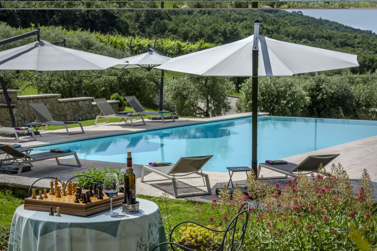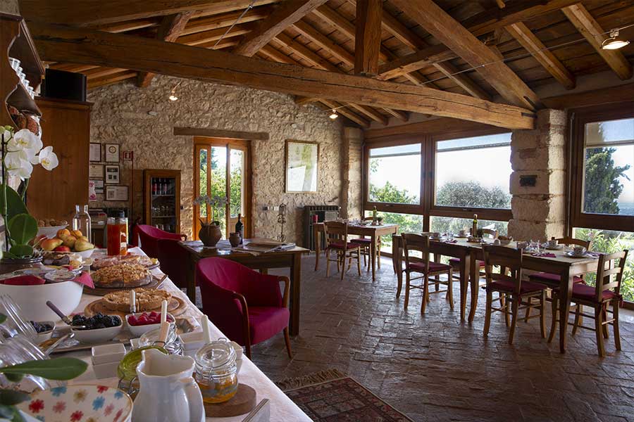 La prima colazione - dai sapori semplici e autentici - è servita in una sala ricavata nel vecchio fruttaio, con muro in sasso, travi a vista e ampie vetrate da cui lo sguardo spazia a perdita d’occhio su vigne, olivi e cipressi.